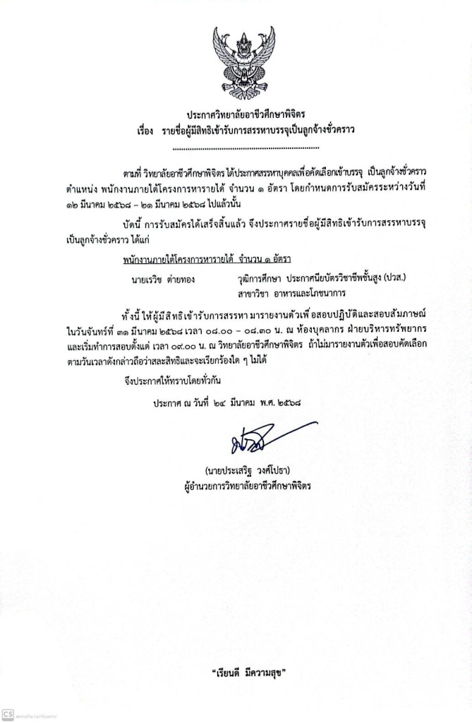 ประกาศวิทยาลัยอาชีวศึกษาพิจิตร เรื่อง รายชื่อผู้มีสิทธิเข้ารับการสรรหาบรรจุเป็นลูกจ้างชั่วคราว